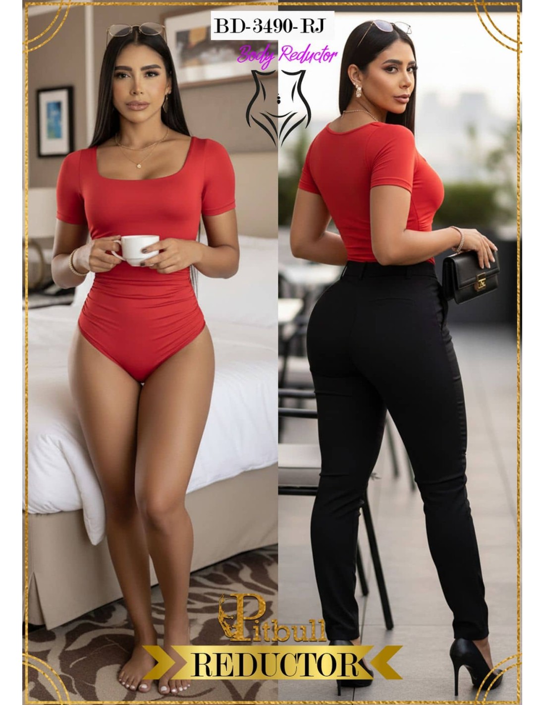 El Body Reductor Pitbull BD-3490-RJ destaca por su diseño de manga corta y efecto reductor de abdomen, combinando comodidad y estilo moderno en una prenda de moda colombiana.