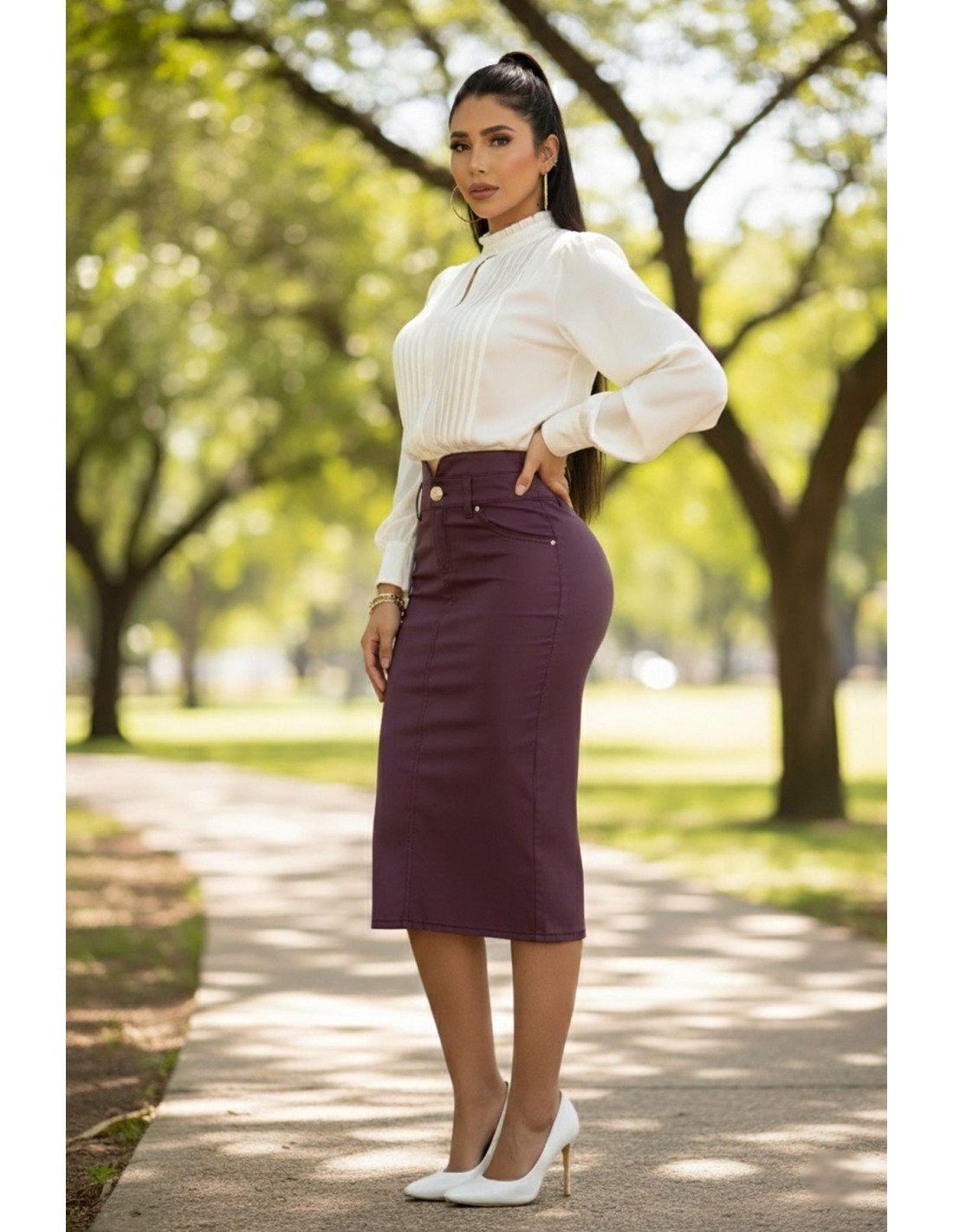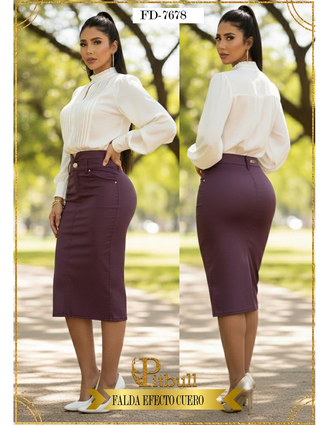 A saia de efeito de couro de jeans Pitbull combina um design sofisticado com o conforto de um ajuste perfeito. Seu acabamento em vinil fornece um toque moderno e sensual, ideal para qualquer ocasião.